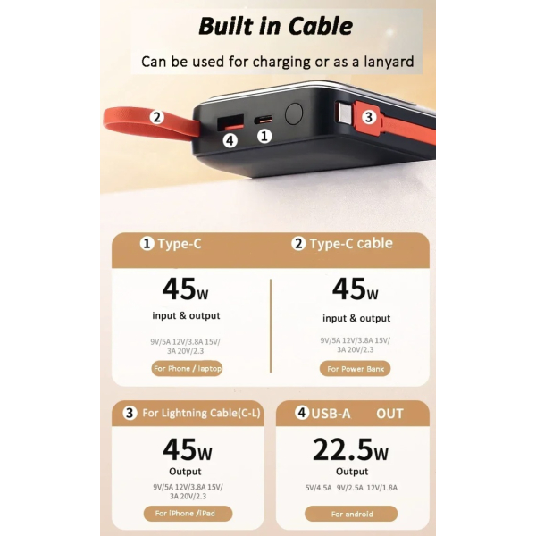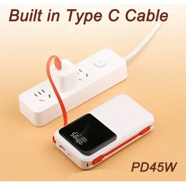 Stay powered anywhere with this 20,000mAh high-capacity power bank, designed for fast and reliable charging on the go. Featuring PD45W fast charging, it quickly powers smartphones, tablets, and compatible laptops, making it ideal for travel, work, and daily use. Compatible with iPhone 15, Xiaomi devices, laptops, tablets, and other USB-powered electronics, this portable charger ensures your devices stay ready when you need them.Equipped with PD45W, FCP, and SCP quick charge technology, it delivers fast and efficient charging while intelligent power management protects your devices. The USB-C input/output port allows flexible charging options and supports modern fast-charging standards.