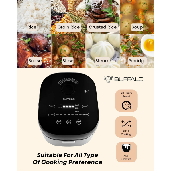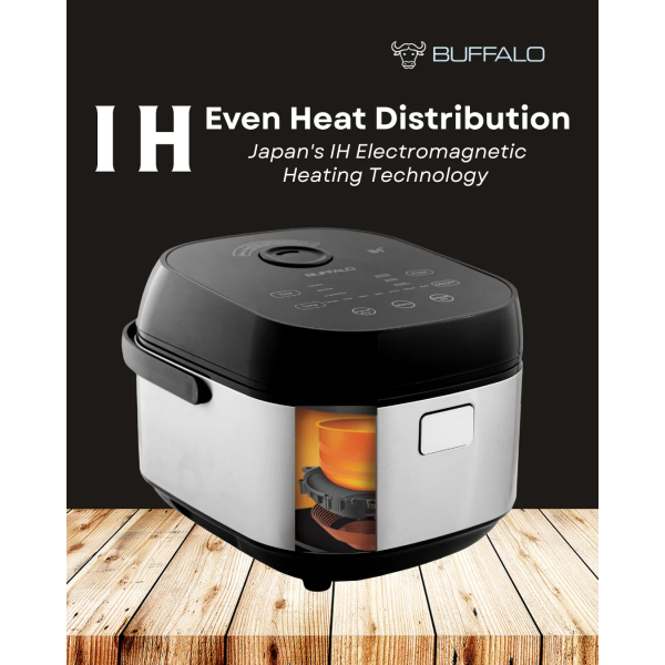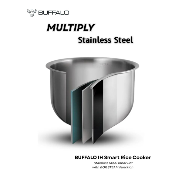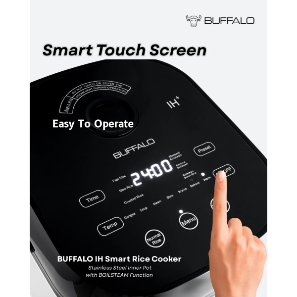 Buffalo brings you the healthiest, safest and most convenient way to cook your rice and meals with the IH Stainless Steel BOILSTEAM Smart Cooker!Family mealtime is easy with the 360-degree heating element, which cooks your rice and meals faster and with more consistent results. Additionally, the stainless steel inner pot features no harmful chemical coatings that could leach into your food.