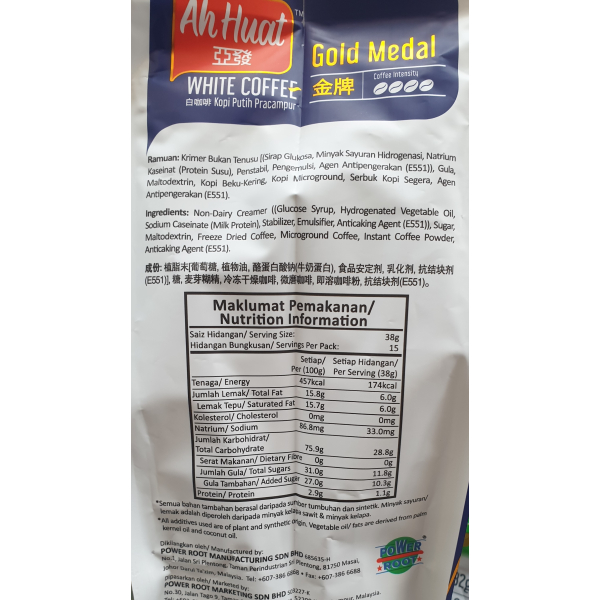 AH HUAT WHITE COFFEE GOLD MEDAL 15'S X 38G