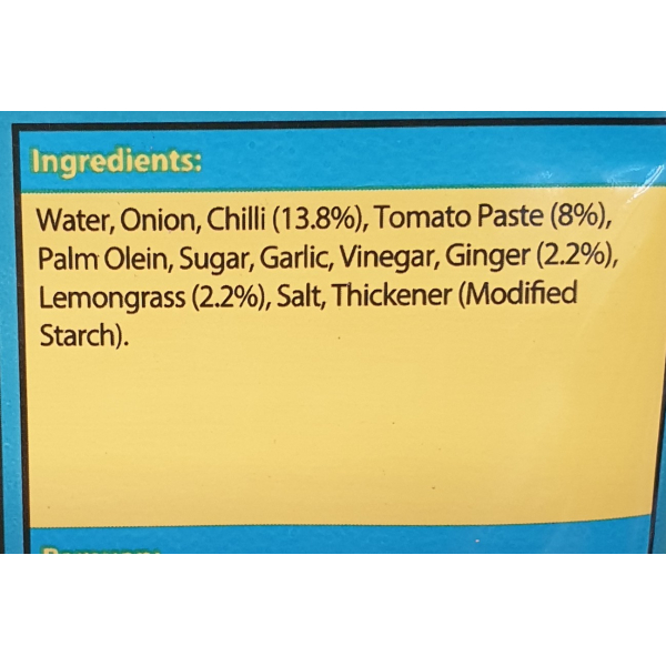 Ingredients: Onion, palm oil, coconut milk (10%) tomato paste (8%), ginger (2.5%), salt, garlic, lemon grass, sugar, tamarind, modified tapioca starch, chilli, galangal, yeast extract, oleoresin chilliTAGS