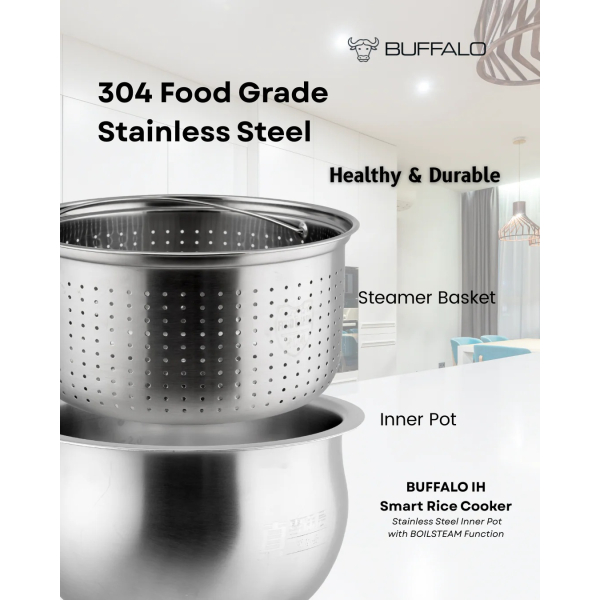 Buffalo brings you the healthiest, safest and most convenient way to cook your rice and meals with the IH Stainless Steel BOILSTEAM Smart Cooker!Family mealtime is easy with the 360-degree heating element, which cooks your rice and meals faster and with more consistent results. Additionally, the stainless steel inner pot features no harmful chemical coatings that could leach into your food.