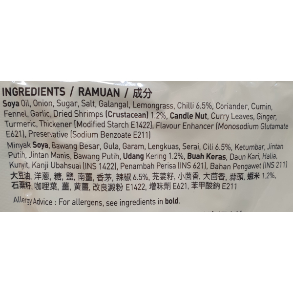 Curry Laksa is a deliciously creamy & spicy soup based noodle. Dollee Curry Laksa is so delicious & easy for a quick meal at home or for a heart-warming gathering with friends & family. Just add water & coconut milk for a satisfying spicy & creamy broth on your favourite noodles.Ingredients: Soya oil, onion, sugar, salt, galangal, lemongrass, chilli 6.5%, coriander, cumin, fennel, garlic, dried shrimps (crustacean) 1.2%, candle nut, curry leaves, ginger, turmeric, flavour enhancer (monosodium glutamate E621), preservative (sodium benzoate E211)TAGS