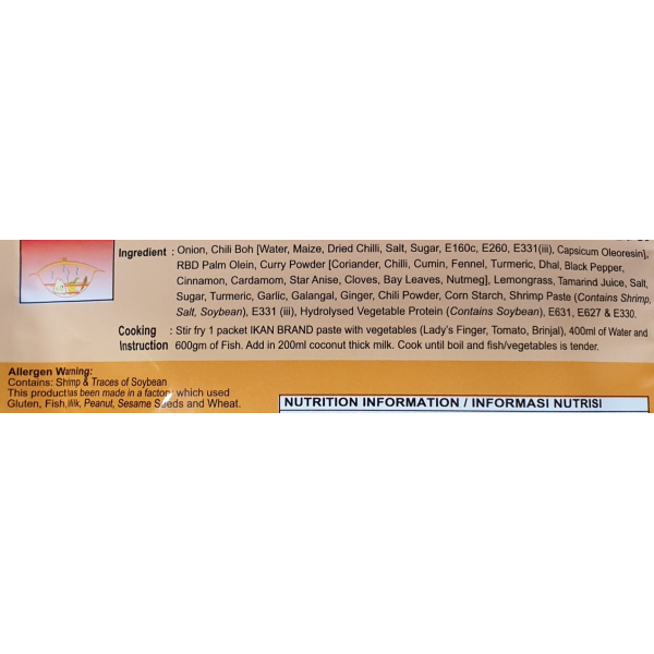 Fish head curry is a dish in Malaysian and Singaporean cuisine with Chinese and Indian origins. It is a curry dish which cooks with fish head or fish meat together with vegetables.NO MSG, NO PRESERVATIVES, NO ARTIFICIAL COLORING, HALAL CERTIFIEDIngredients: Chili Boh, Onion, RBD Palm Olein, Curry Powder, Lemongrass, Tamarind Juice, Salt, Sugar, Turmeric, Garlic, Galangal, Ginger, Chili Powder & Shrimp Paste (Contain Shrimp).TAGS