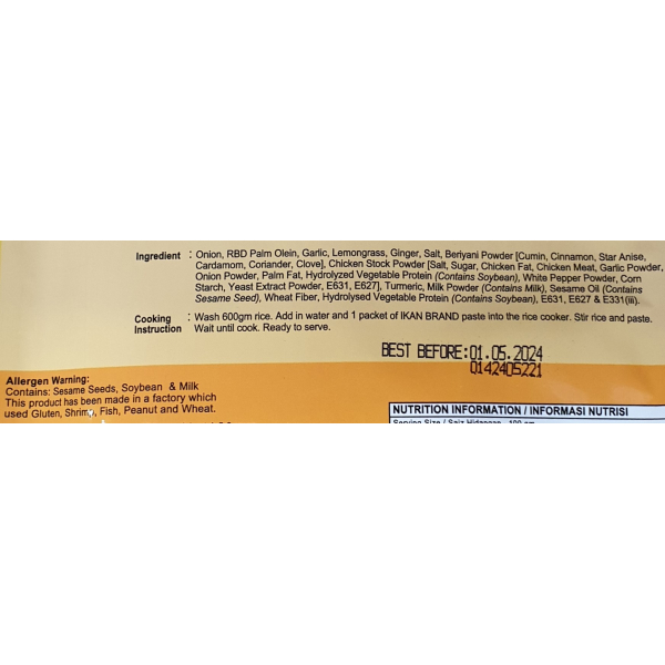 Beriyani Paste is a type of paste which used to cook rice with highly flavoured and coloured with saffron or turmeric. It is a Malay dish which usually eats with Masak Merah or Rendang.NO MSG, NO PRESERVATIVES, NO ARTIFICIAL COLORING, HALAL CERTIFIEDIngredients: Onion, RBD Palm Olein, Garlic, Lemongrass, Ginger, Salt, Beriyani Powder, Chicken Stock Powder (Contain Soybean), Turmeric & Sesame Oil (Contain Sesame Seed).TAGS