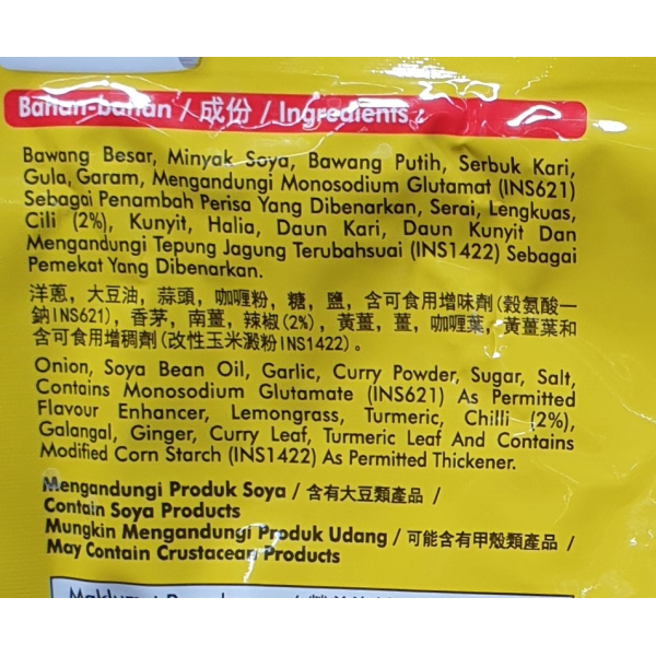 Ingredients: Onion, soy bean oil, garlic, chilli (7%), sugar, salt, curry powder, lemon grass, monosodium glutamate, galangal, turmeric, ginger, curry leaves, modified corn starch, turmeric leafTAGS