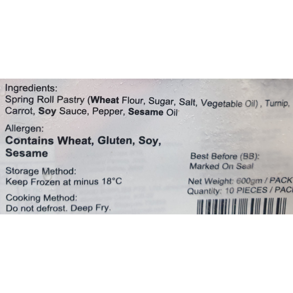 VEGETARIAN SPRING ROLL 60G X 10'S( VEGAN )